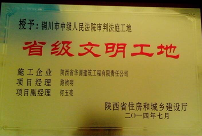 在公司領(lǐng)導層的指導下及項目部各人員的努力工作下,秉承務實求真高效的原則,由我公司承建的銅川市中級人民法院審判法庭工地被評為省級文明工地,榮獲省級文明工地榮譽證書。該項目由銅川市中級人民法院投資建設(shè),由陜西建新項目管理咨詢有限公司負責監(jiān)理,由陜西省華源建筑工程有限責任公司承建。
